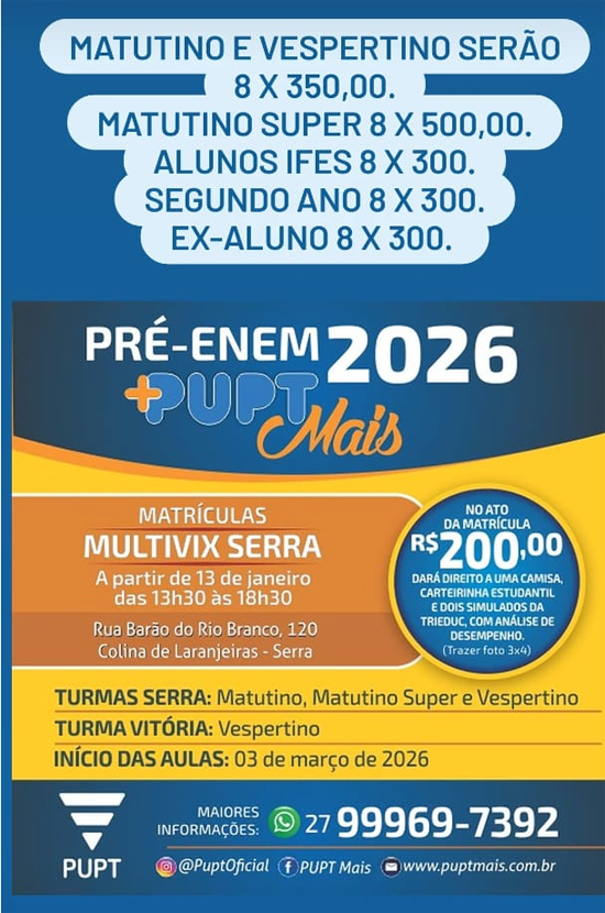 O Pré-ENEM do PUPTMais, tradicional "cursinho da UFES" já se encontra com as matrículas abertas. Teremos turmas inicialmente em 02 turnos: Matutino e Vespertino. Ex-alunos e alunos do IFES possuem um desconto na mensalidade!!...